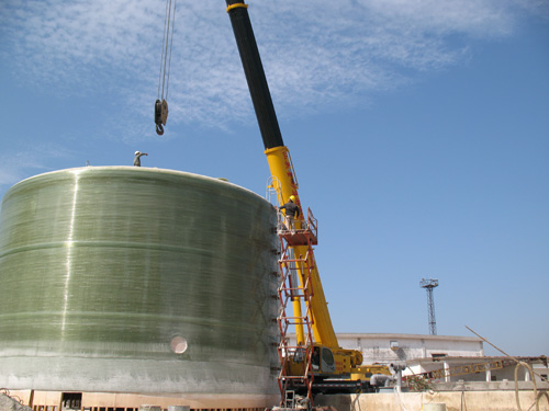 2012年10月8號廣州市固肽玻璃鋼有限公司與潮州化工廠簽訂的容積為1745m3.直徑16米、高度10米、重量達(dá)14噸、介質(zhì)為鹽酸的現(xiàn)場纏繞大型玻璃鋼儲罐正式吊裝成功。