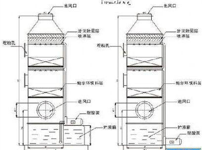 方法3、在出料口增加尾氣吸收塔,目前,固肽玻璃鋼采用兩種型式的吸收塔,一種是酸霧經(jīng)過水,變成酸性廢水,廢水排出,到中和池中中和。第二種,在玻璃鋼塔內(nèi)通過中和液中和玻璃鋼鹽酸罐內(nèi)的酸霧。此種方法優(yōu)點(diǎn):能有效處理玻璃鋼罐內(nèi)排出的酸性廢氣,有效的保證玻璃鋼罐的安全使用,不足之處投入效其它方法要求